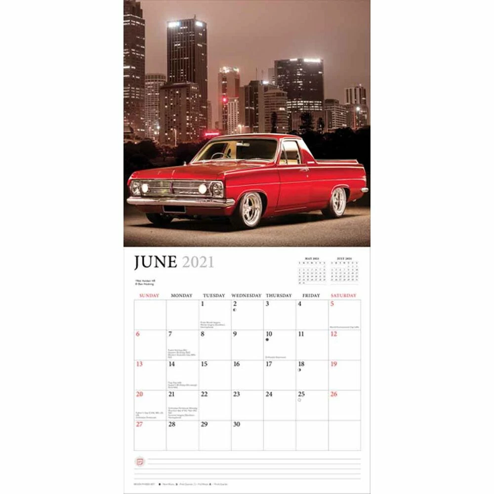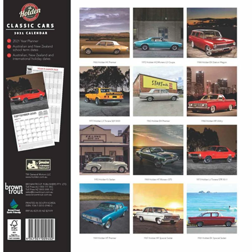Get prepared for the year ahead with a square Classic Holden 2021 calendar from Supercheap Auto. Each month brings with it a new high quality image of a classic Holden vehicle and features Australian and NZ public holidays and other notable dates with enough room to write down your personal dates and plans. These calendars come reinforced with a cardboard insert and are shrink-wrapped, perfect as a gift and sturdy enough to resist damage in the post.
