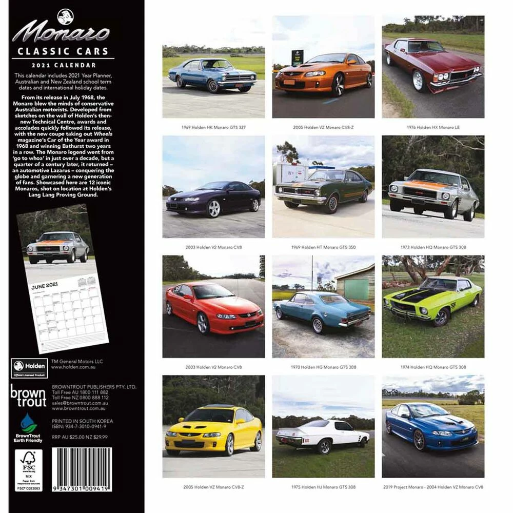 Get prepared for the year ahead with a square Monaro 2021 calendar from Supercheap Auto. Each month brings with it a new high quality image of a classic Holden Monaro and features Australian and NZ public holidays and other notable dates with enough room to write down your personal dates and plans. These calendars come reinforced with a cardboard insert and are shrink-wrapped, perfect as a gift and sturdy enough to resist damage in the post.